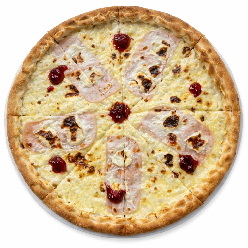 smetanový základ, sýr. šunka, hermelín, brusinky, oregáno