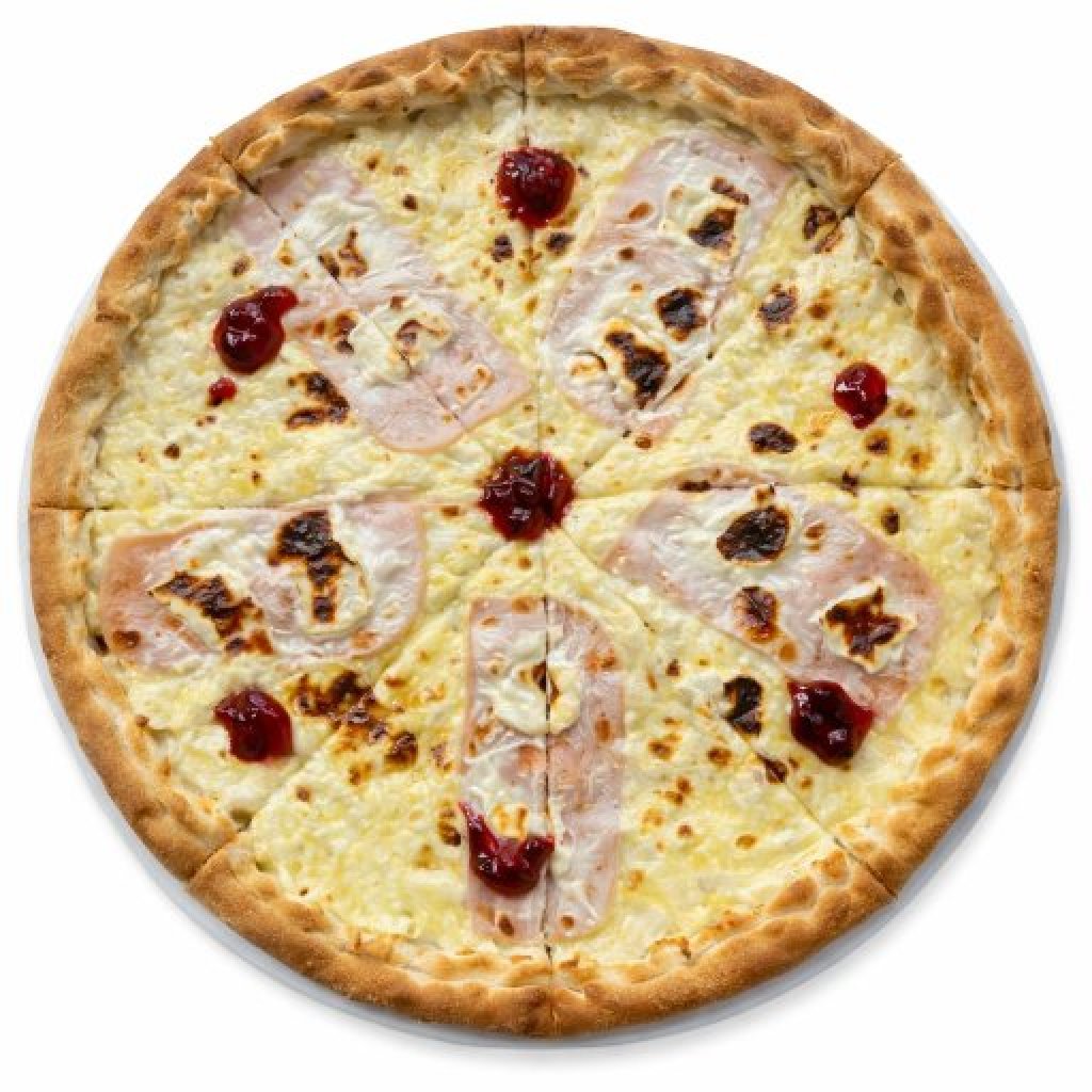 smetanový základ, sýr, šunka, hermelín, brusinky, oregáno
