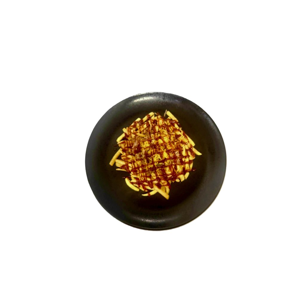 Hranolky s trhaným masem, cheddarem a BBQ omáčkou