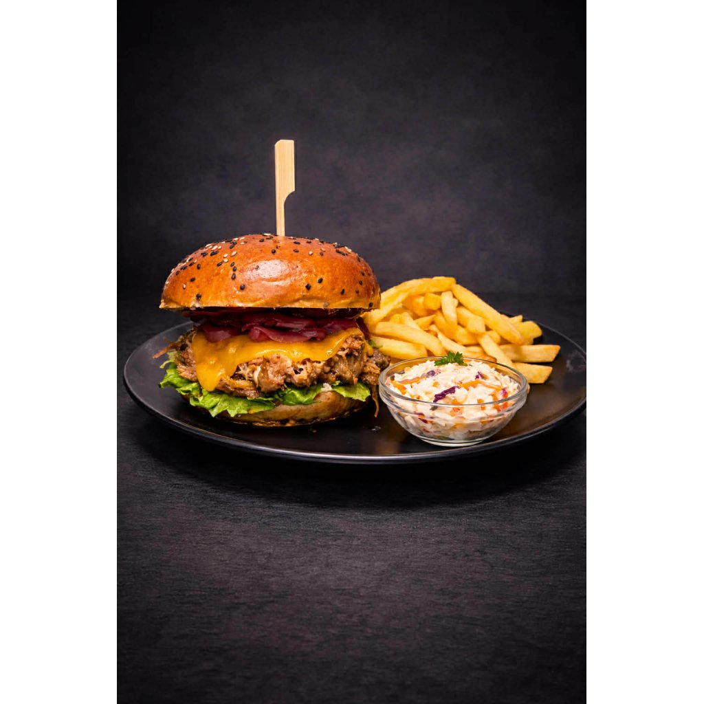 180G TRHANÉ VEPŘOVÉ MASO, BBQ OMÁČKA, LED.SALÁT, CHEDDAR, OKUREK, HRANOLKY, SALÁT COLESLAW (1,7)