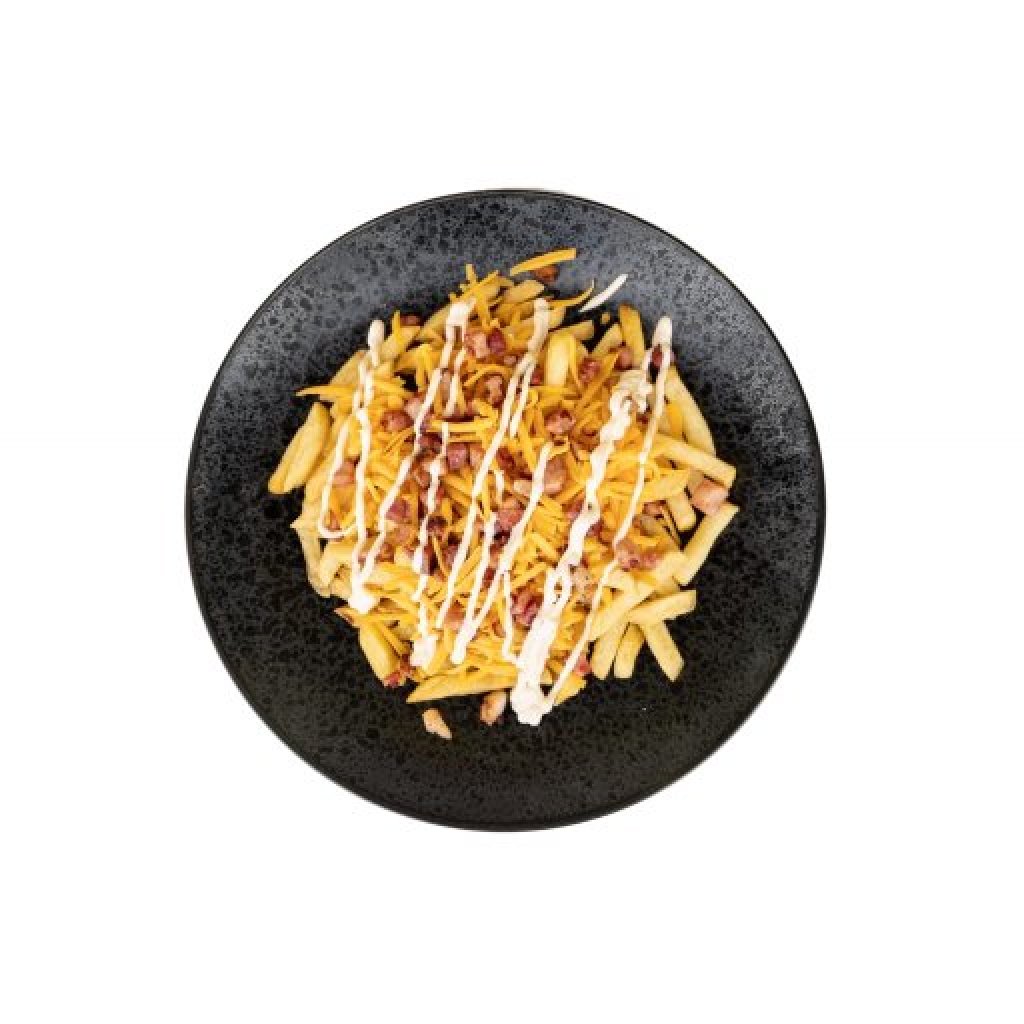 Hranolky s křupavou slaninou, čedarem, sýrovou omáčkou